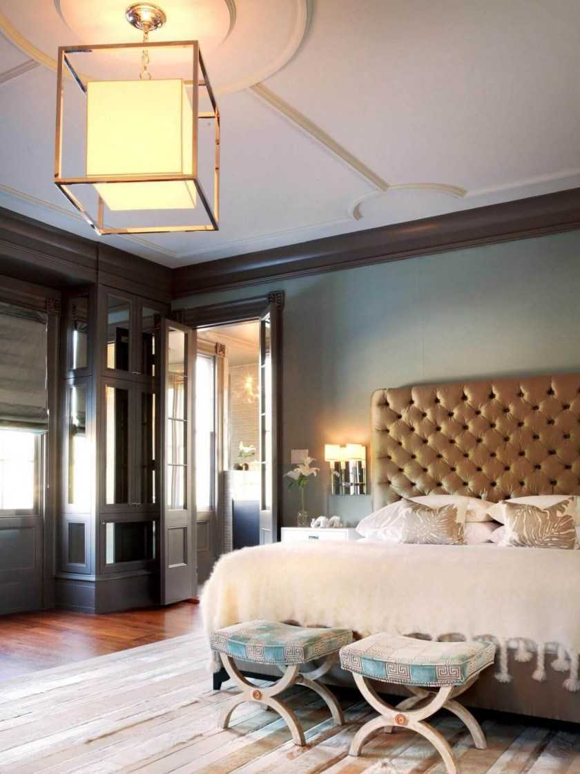 Очень удачной можно назвать цветовую гамму, выбранную для этого проекта спальни, а также орнаментальное оформление текстиля. Благодаря удачному сочетанию цвета и рисунка, интерьер выглядит респектабельно, несмотря на минимальное количество мебельных аксессуаров.