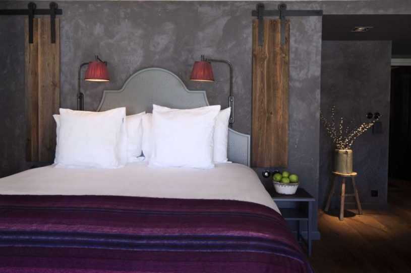 В качестве ночников использованы плоские светильники достаточно большого размера, которые закреплены на стене в изголовье двуспальной кровати. Отделка стены обладает некоторым глянцевым эффектом, способным усиливать свет от бра.