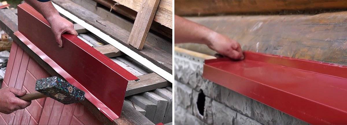 Последним может выступать как изделие из ассортимента аксессуаров к определённой коллекции сайдинга (например, J-фаска), либо кровельное железо — листовая сталь с полимерной защитой. Элементы отлива, в крайнем случае, изготавливаются индивидуально, этот способ хорошо подходит при неравномерном выступе цоколя за плоскость основной отделки. Ничего хитрого в таком варианте устройства отлива нет — просто сгибается Г-образный конёк с верхней завальцованной кромкой и нижним Z-образным краем.