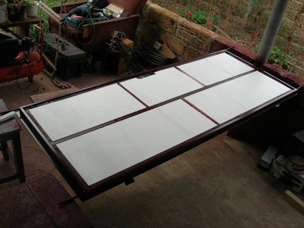 Следует подчеркнуть, что используемая фанера должна обладать влагостойкими свойствами. Кроме того, как она установлена, рекомендуется заранее её покрыть глянцевой краской.Теперь следует вдвоём взять лист фанеры и аккуратно, чтобы не повредить пенопласт, задвинуть внутрь установленной монтажной планки.