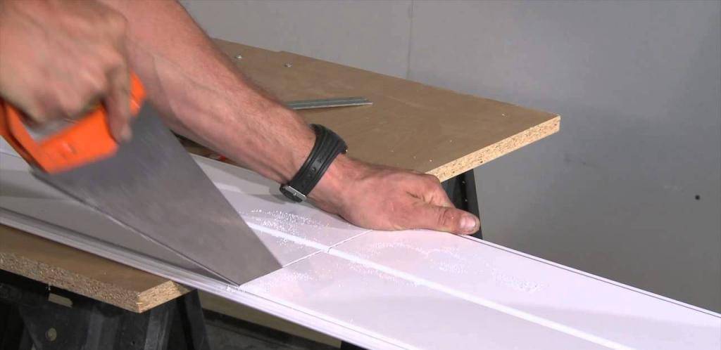 Пластиковые рейки подрезаются под нужный размер, который определяется расстоянием от стартового профиля на одной стене и плоскостью противоположной стены. Резать панели можно ножовкой по металлу, острым ножом или электролобзиком.