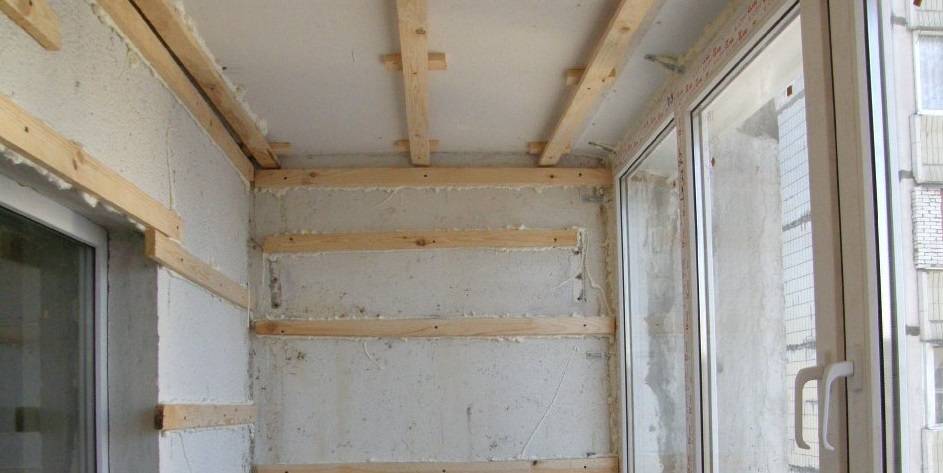 Каркас лучше собирать из деревянных брусков, а не из металлических профилей. Металл со временем ржавеет, и от этого на панелях появляются пятна. Подходящий размер бруса — 20х45 мм. Рейки укрепляют вдоль балкона: одну монтируют вплотную к стене, вторую — по центру потолка.