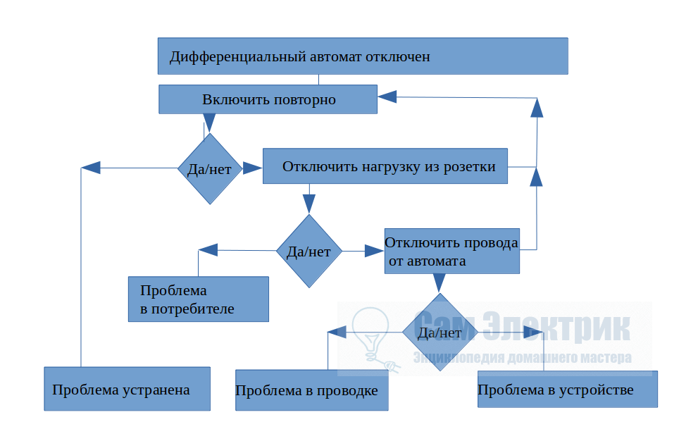 Алгоритм поиска причины срабатывания дифференциального автомата предоставлен на схеме: