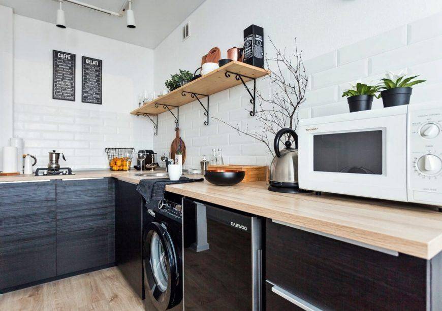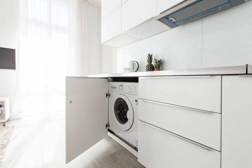 Именно поэтому специалисты не советуют выбирать для размещения машинки только ванную комнату. Более подходящим местом может стать кухня, потому как в ней есть свободный доступ к водопроводу и канализации, а также допускается возможность расположить технику подальше от прочих объектов в пространстве. Запитать машинку получится от розетки, расположенной на кухне. Как правило, они находятся на отдельных автоматах в щитках распределения.
