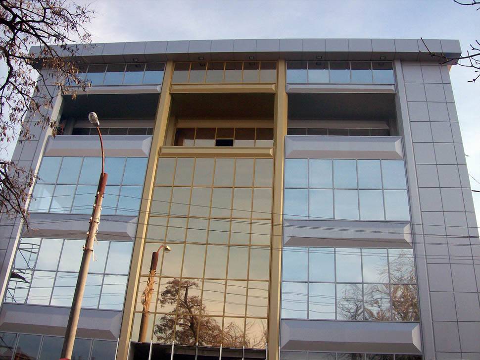 Облицовка с использованием стекла и алюминиевых плит