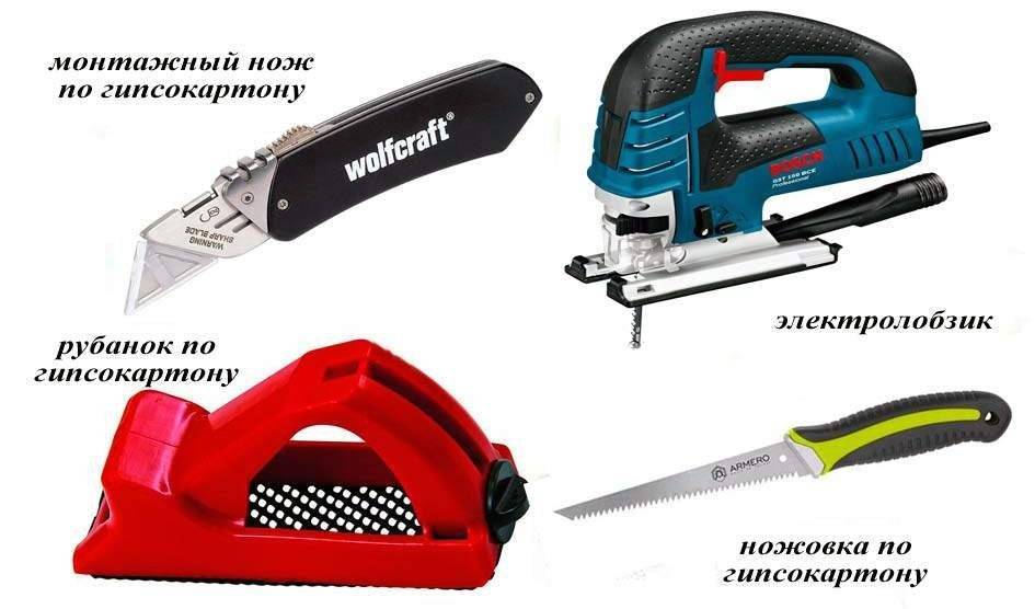 Ножницы по металлу для обрезки металлопрофиля, строительный нож для резки листов с набором запасных лезвий, специальный обдирочный рубанок с лезвием для гипсокартона, он не обязателен, но значительно облегчает зачистку обрезанных сторон, крупнозернистая наждачная бумага и специальная терка под нее, ручная ножовка, круговая фреза или набор фрез для прорезки отверстий под светильники и прочие нужды, если они потребуются.