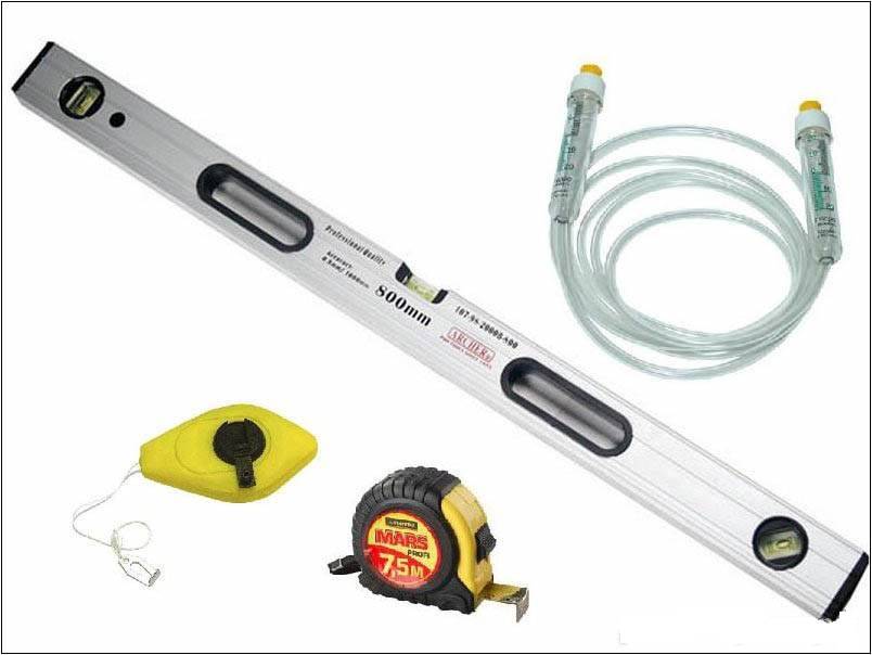 Гидравлический или лазерный уровень, обычный линейный уровень. Измерительная рулетка длиной не менее 5 метров, отвес с нитью не менее 3 метров. Металлическая линейка длиной от 40 см, металлический строительный угольник. Малярное правило длиной не менее 1,5 метра, с помощью которого удобно выполнять разметку и раскройку гипсокартона, а также вымерять плоскость профилей при монтаже. Пара строительных карандашей и пара перманентных маркера (строительных) темного цвета, для разметки профилей. Моток плотной капроновой нитки темного цвета для фиксации плоскости, обивочная нить желательно красного цвета, для разметки по черновому потолку и стене.
