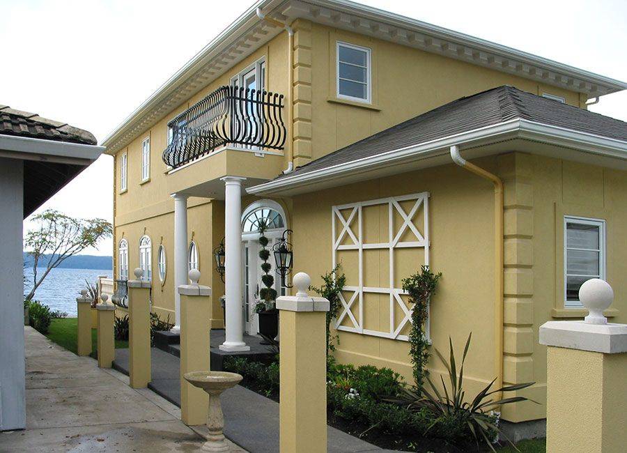Отдельно стоит описать принцип окрашивания стен с сочетанием фактурных и гладких участков. Мастера рекомендуют начинать окрашивать фасад с оформления фактурных элементов.