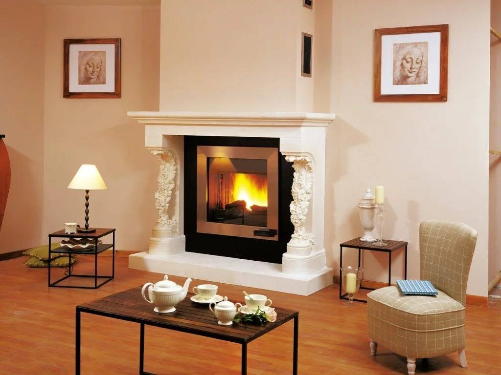 Для таких моделей зазор между задней плоскостью аппарата и стеной выдерживается не менее 50 мм. Исходя из этого, рассчитываются габариты будущего каминного портала. Для облицовки можно взять керамическую плитку, фактурный керамогранит. Превосходно смотрится гипсовая лепнина.