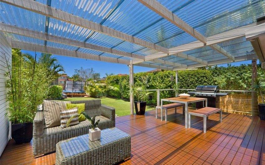 - Профилированный поликарбонат подходит для отдельно стоящих и пристроенных к дому навесов, козырьков, беседок, ограждений.
