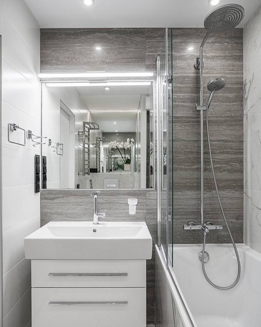 Очень многие перед началом ремонта в ванной комнате начинают с подбора плитки для стен и пола, поэтому с этого и начнем. В большинстве случаев в ванных комнатах в качестве отделки стен применяют или керамическую плитку, или керамогранит, также встречаются проекты с применением покраски стен и частичным применением плитки, но это не наш случай