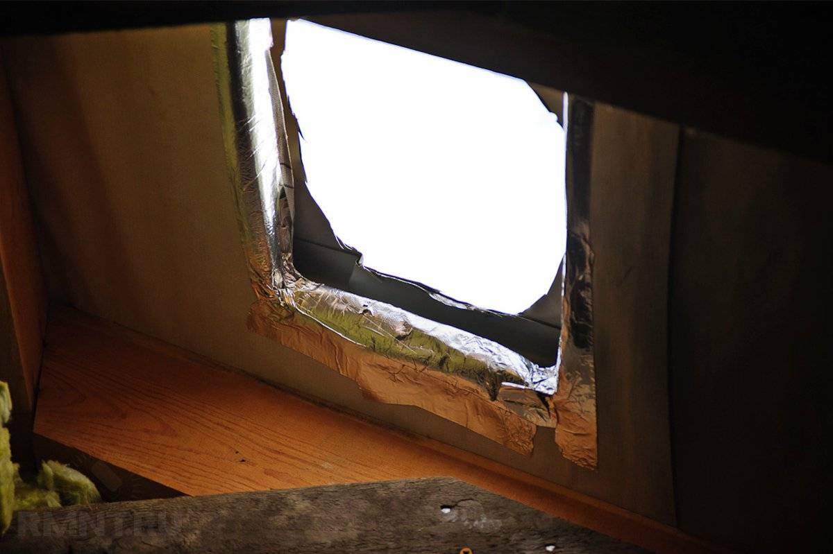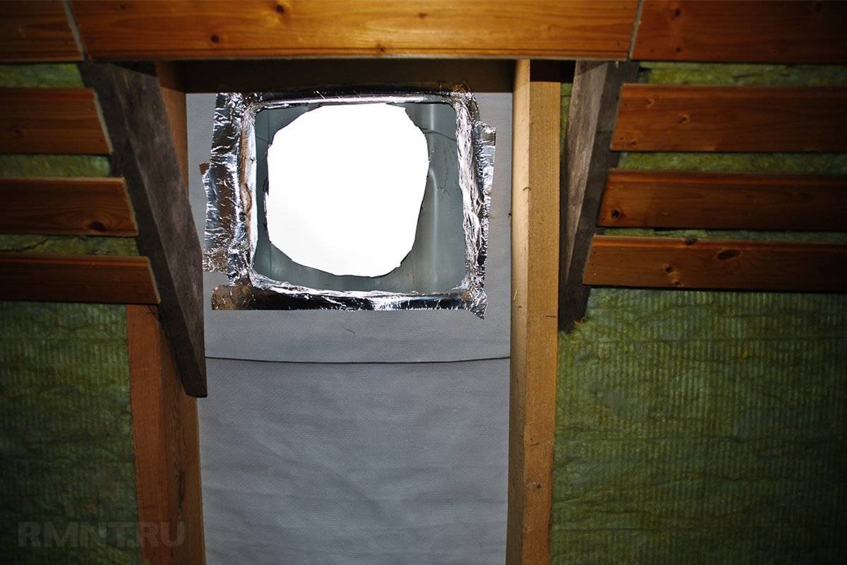 С учётом габаритов дымоходного канала определить размеры проёма достаточно просто. Следом идёт нанесение разметки на детали внутренней обшивки и обрешётки. Парозащитные и гидроизоляционные материалы разрезают конвертом и заворачивают внутрь пирога. Далее внутренние поверхности проёма следует отделать гидроизоляционным материалом, не чувствительным к нагреву, как правило в этих целях используют алюминиевую или медную фольгу.