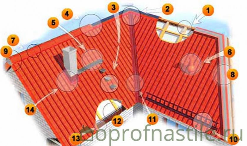 Кровля из профнастила, примыкания которой к стенам здания, а также дымовым и вентиляционным каналам недостаточно надежны, может создать хозяевам дома множество проблем. Попадание воды на фронтоны или наружные стены серьезно испортит отделку фасада, а протечки по кладке дымовых и вентиляционных каналов могут привести к выходу из строя деревянных элементов стропильной системы. В приведенной ниже таблице можно увидеть основные элементы кровли из профнастила, там же указано и их назначение.
