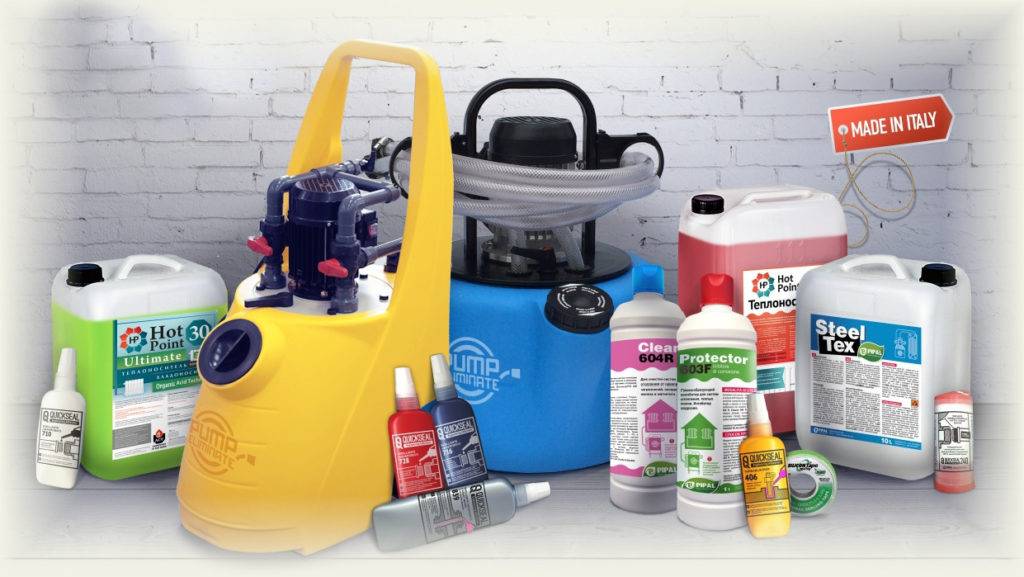 Для чистки системы требуется подключение насоса с заполненной химическими веществами емкостью. Моющее средство растворяет и отслаивает прилипшие к стенкам труб загрязнители.