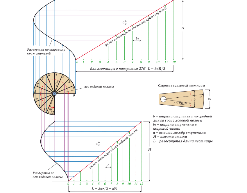 Чтобы винтовая лестница была удобной и безопасной, ее расчет следует выполнять согласно формуле