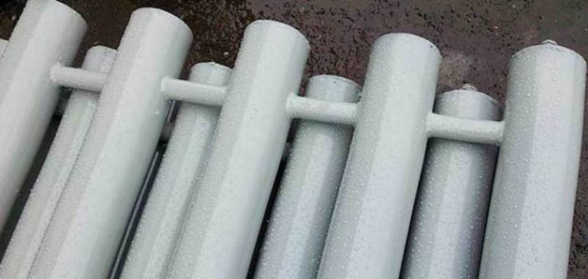 Секции соединяются между собой стальной арматурой путем технологической сварки с расстоянием между секциями на 50 мм большим, чем диаметр труб, и снабжаются плоскими заглушками со штуцерами (под приварку или оснащенными резьбой). Максимальный показатель давления для этого устройства составляет 1,0 МПа.