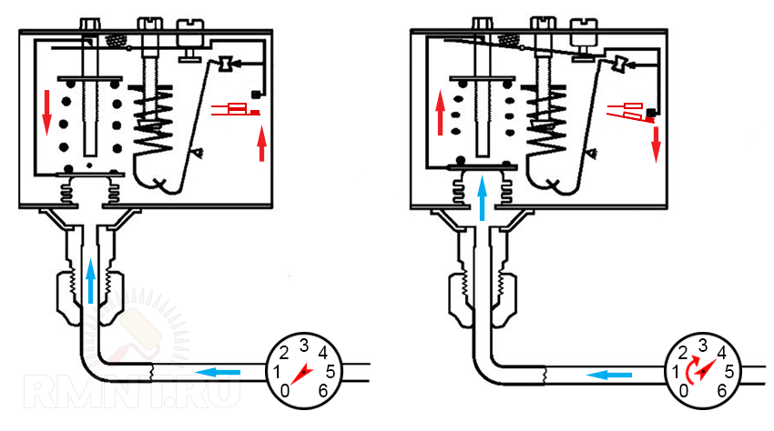 За регулировку реле отвечают две прижимные гайки, находящиеся на стержнях с пружинами. Они имеют соответствующие обозначения. Одна отвечает за высокое давление, вторая за низкое.
