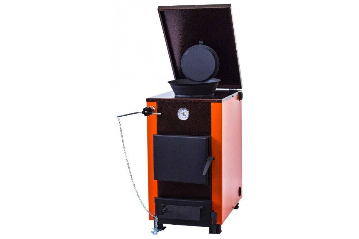 Этот экономичный агрегат устанавливают в котельные частных домов или бытовых сооружений, в которых имеется система водяного отопления. Его конструкция позволяет использовать максимум тепловой энергии при сгорании дров или черного угля. Малогабаритный котел можно монтировать практически в любых топочных. Полимерное покрытие не позволяет котлу ржаветь. Совместим с разными видами дымоходов. Большие конфорки плиты разрешают грузить уголь из ведра.