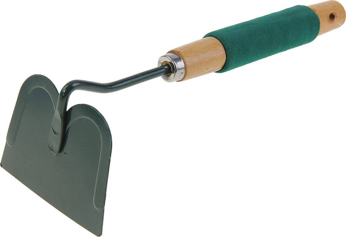 - Треугольная – с лезвием в виде равнобедренного треугольника, где равные стороны имеют заточку и сходятся под тупым углом, если речь идет о полноразмерном инструменте, и под острым, если говорить о миниатюрных моделях тяпок. В последнем случае форма рабочей части напоминает сердце, если все углы получили скругление. С противоположной стороны может быть трезубец или двузубец, как на рисунке выше.