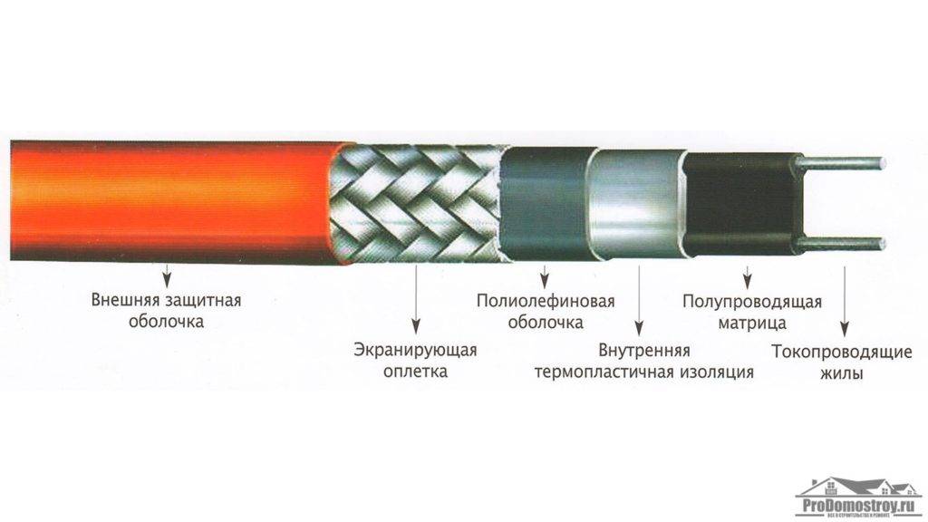 Более удобной в плане эксплуатации является такая разновидность греющего кабеля, как саморегулируемый. Он имеет более сложную конструкцию и не бывает одножильным. Саморегулируемый проводник включает в себя: