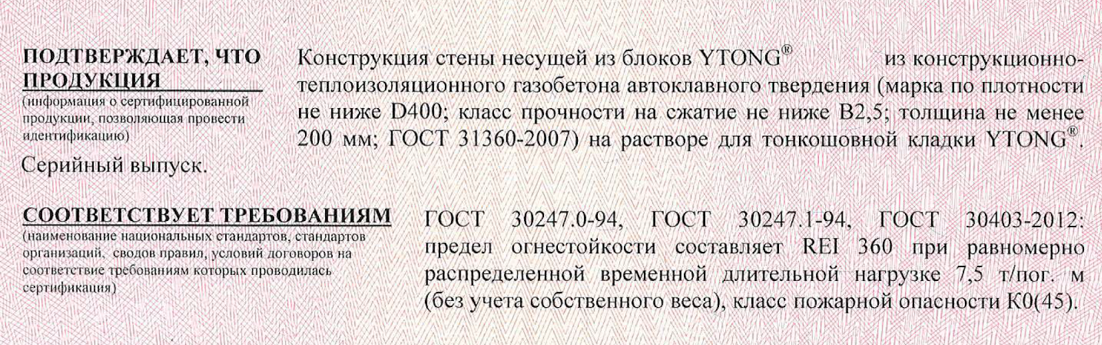 Газобетон – негорючий материал. Несущая конструкция из газобетона YTONG на растворе для тонкошовной кладки по результатам независимых испытаний соответствует классу пожарной опасности К0(45)**. То есть является непожароопасной при времени теплового воздействия 45 минут. И может выступать в качестве противопожарной преграды. Такой класс присваивается только тем конструкциям, которые не поддерживают горение и не выделяют вредных веществ при прямом воздействии огня.