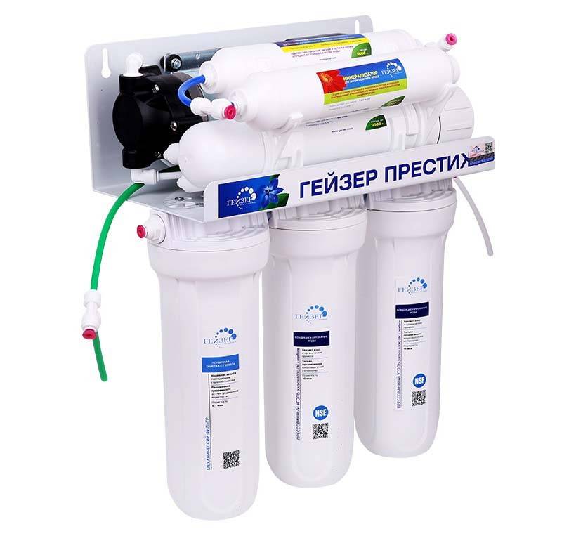 Примером классического обратного осмоса есть Гейзер Престиж с принципом работы системы обратного осмоса. Особенностями Гейзера престиж есть наличие в схеме накопительного бака на 12 литров и насоса. Гейзер Престиж с обратным осмосом может фильтровать воду до кристального состояния, в этом ему помогает мембрана. Гейзер Престиж удаляет из воды все вредные примеси, и тем самым заботится о вашем здоровье.