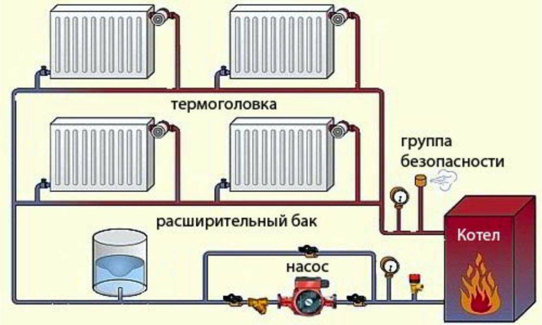 Схема контура включает те же устройства и элементы, что и обычная однотрубная система. И дополнительно имеет насос. Он может быть врезан двумя способами: