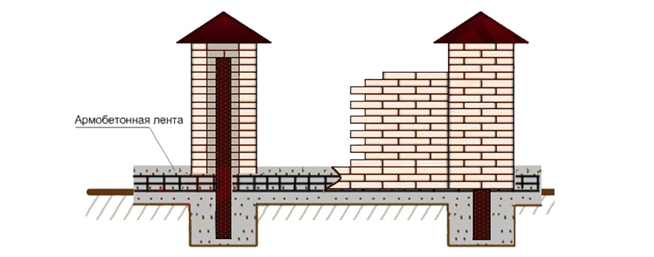 Ну а под тяжелое каменное или кирпичное ограждение нужно возводить ленточный фундамент с полным заглублением (ниже глубины промерзания). Столбы для забора из кирпича или камня возводятся по тем же правилам, что и для более легких полотен.