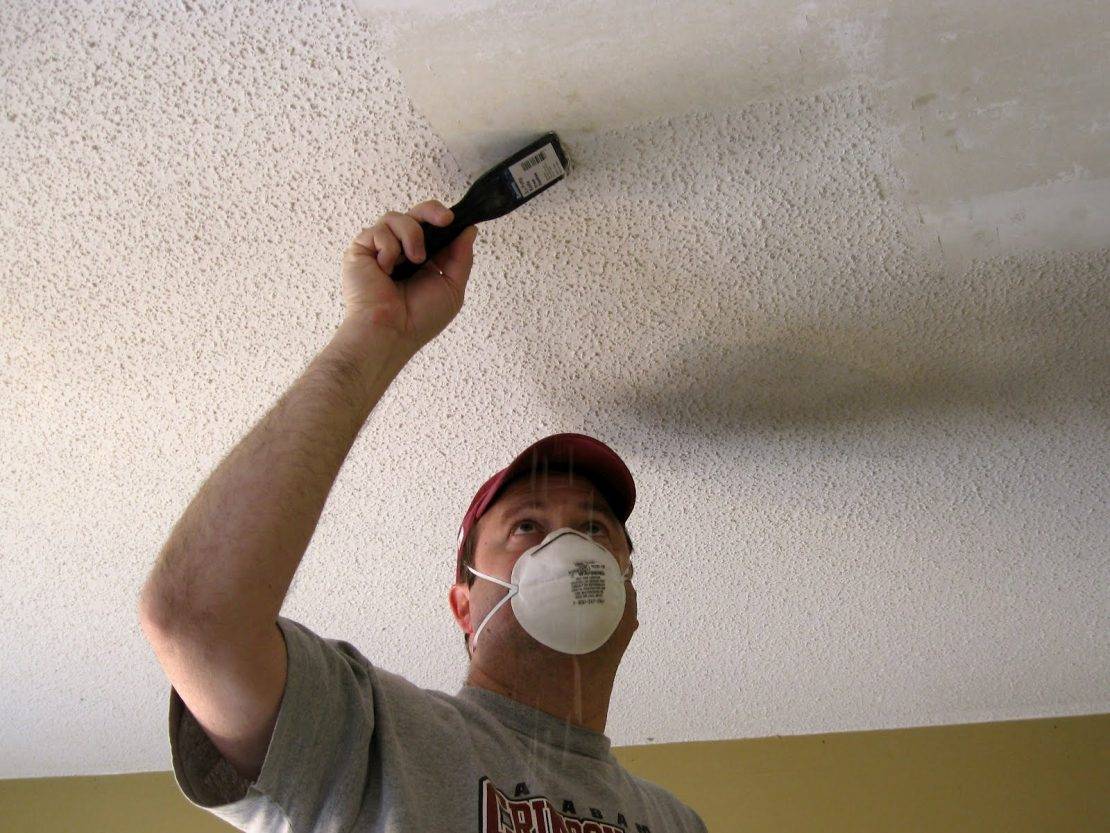 - Удалить старое покрытие с потолочных панелей абразивным инструментом или шпателем. Для очистки от обоев и толстого слоя эмульсионной краски поверхность смочить водой. Для снижения количества пыли использовать электрическую шлифовальную машинку, соединенную шлангом со строительным пылесосом.