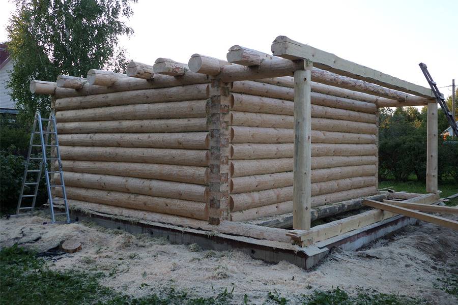 Можно сделать обрешетку под металлочерепицу, тогда меньше дождевой воды попадет на дерево. Для веранды ставят лифты для сокращения усадки под подпорные столбы.