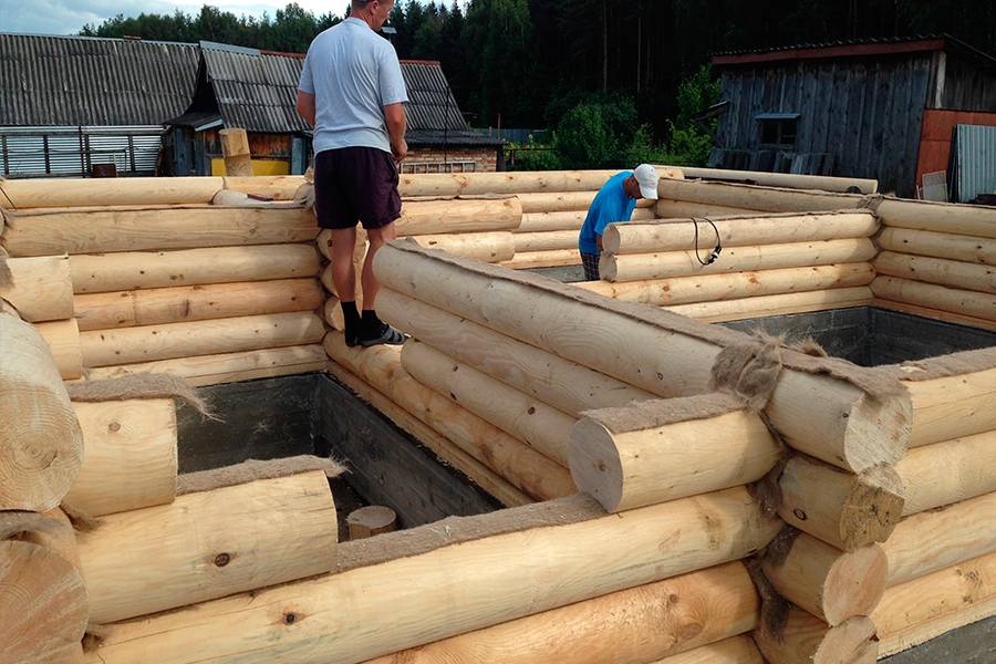 Сруб бани, благодаря горизонтальной изоляции, не будет подвержен грунтовой влаге, которая может подниматься по бетону фундамента благодаря порам-капиллярам. После первого венца устраиваются остальные. Весь сруб из бруса нужно монтировать по венцам, чтобы пиломатериалы в углах и прочих примыканиях перевязывались друг с другом.