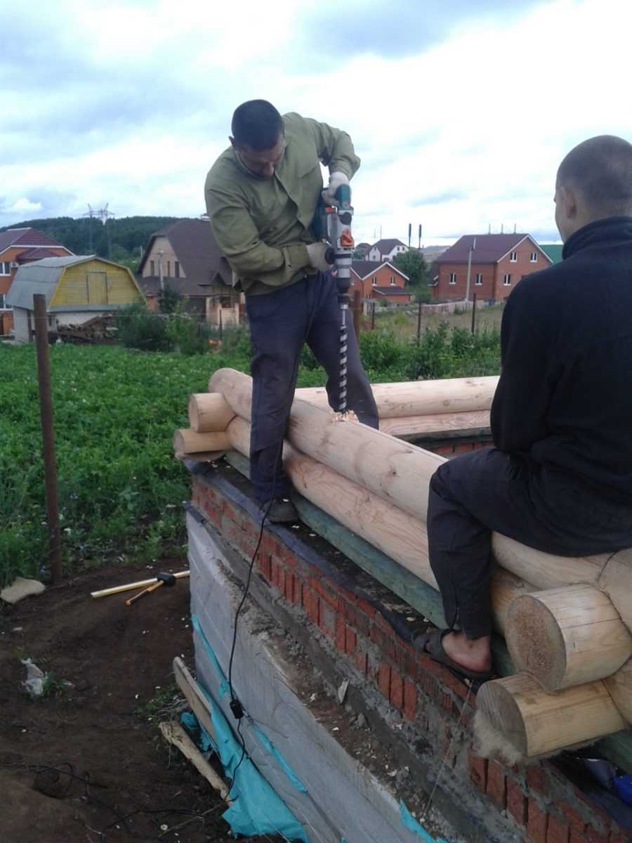 Не желая тратить время на подготовку этих самых нагелей и на сверление отверстий большого диаметра, я просто использовал гвозди длиной 200 мм. Гвозди забиваются очень быстро, а если углубить шляпку на 3-5 см в верхний брус, то гвоздь надежно свяжет два венца, не позволяя им сдвигаться.