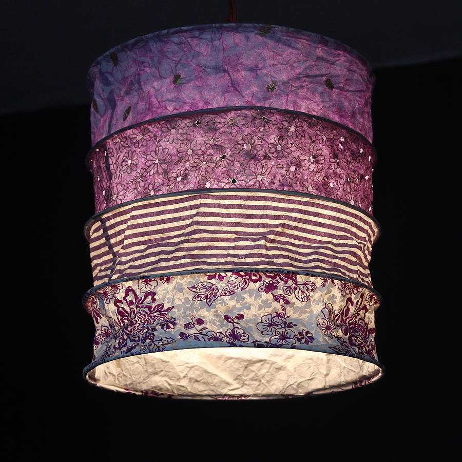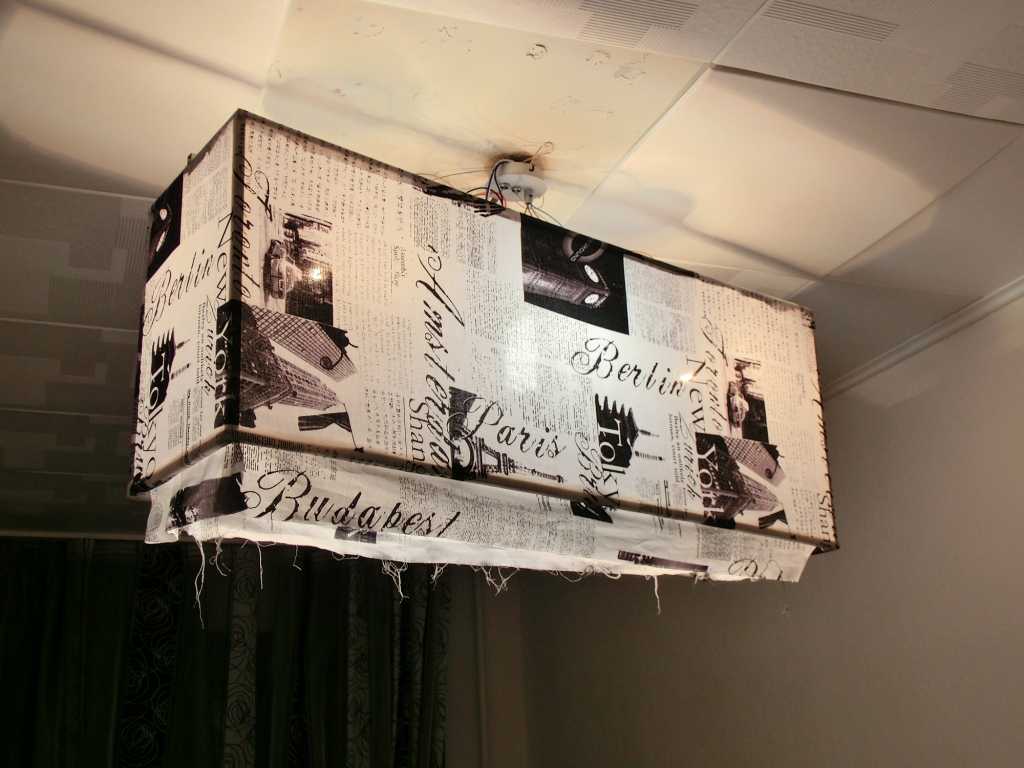 Внешний вид такого плафона зависит также от поверхности — однотонная, узорчатая, газетная и так далее. Комбинируя эти материалы, можно достигнуть совершенно разных эффектов.