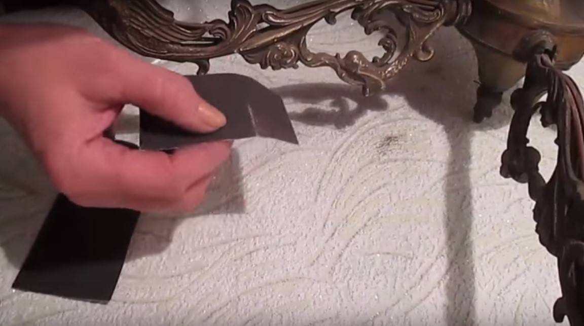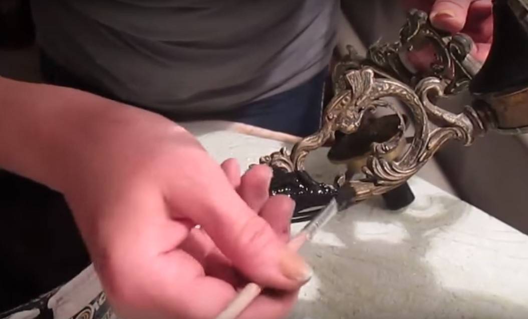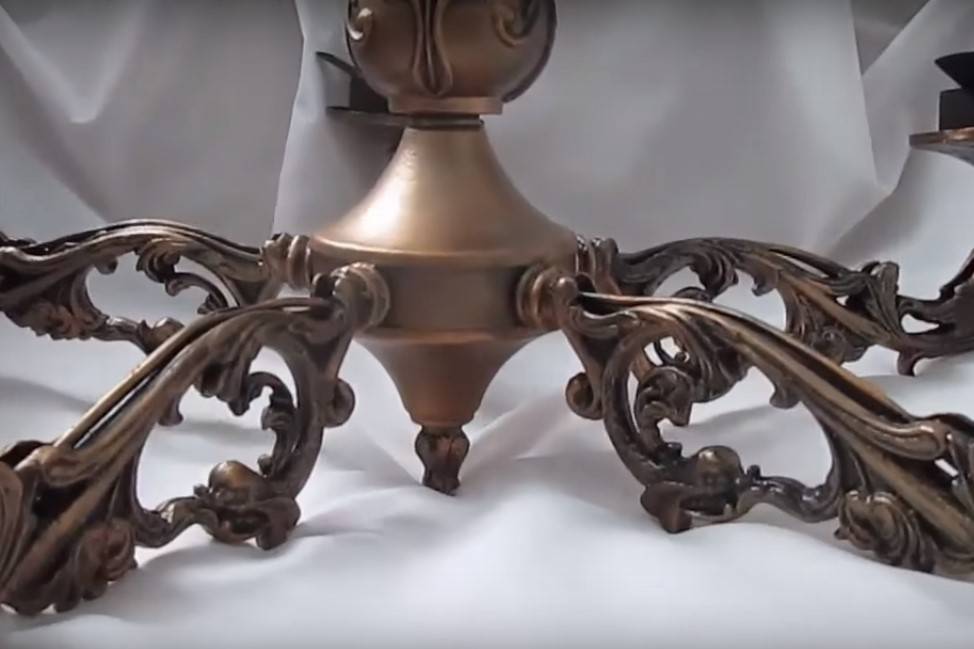 Чтобы отреставрировать люстру, сначала изделие разбирают и зачищают каркас наждачкой. Покрывают чёрной краской с одной стороны и дают подсохнут 20-25 минут. Переворачивают и делают то же самое с другого бока. Если потребуется, повторяют, пока слой не станет однородным.