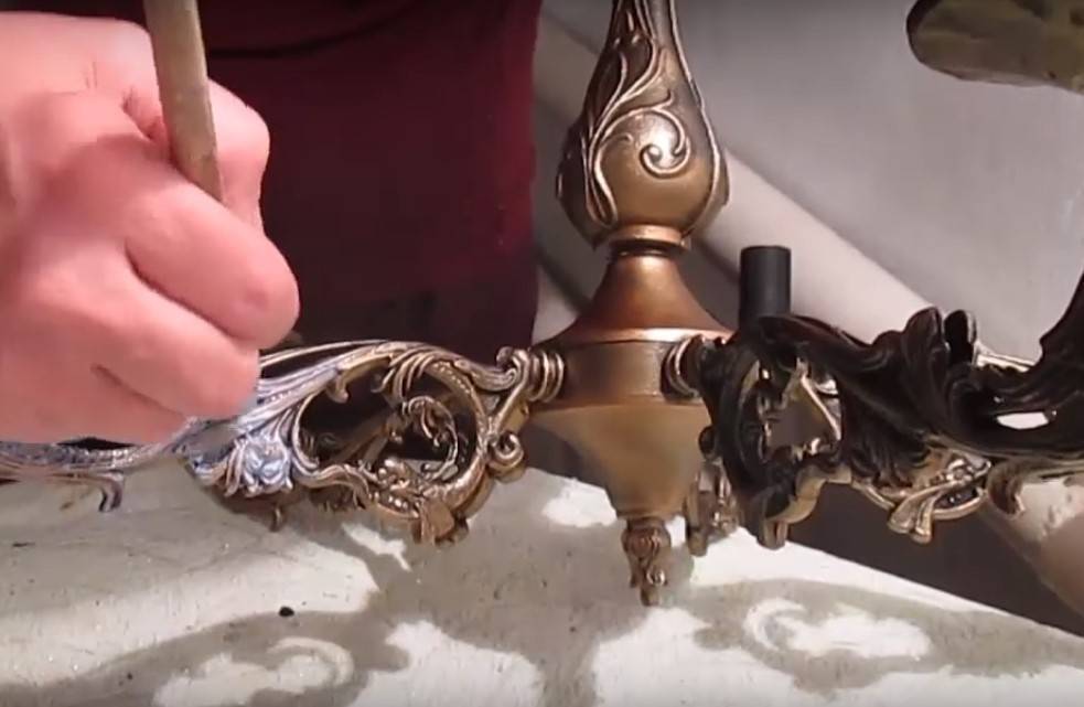 Окрашивание получается неравномерным, из-под слоя краски просвечивает предыдущая, тёмная, особенно в углублениях. Благодаря этому после восстановления советская люстра выглядит как старинная, покрытая патиной. Сверху наносят слой лака для защиты от внешних воздействий.