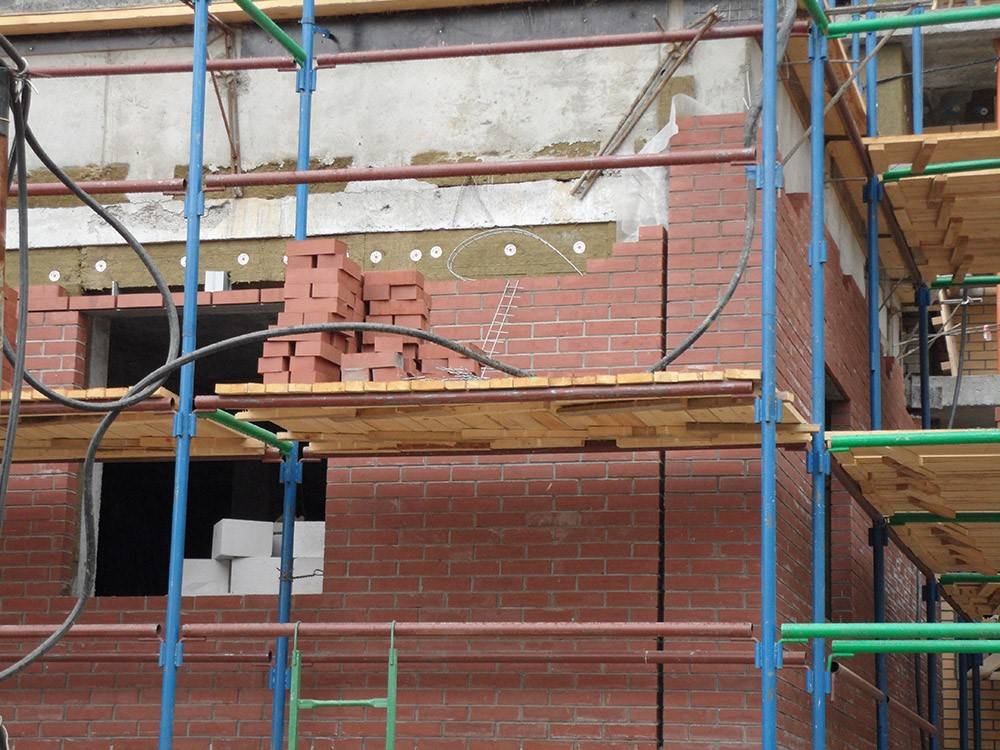 Если фасадные работы вы не планируете выполнять самостоятельно (а собираетесь нанять строительную бригаду), то о лесах можно особо не задумываться, так как строители обычно приходят на участок со своими лесами и подмостями.