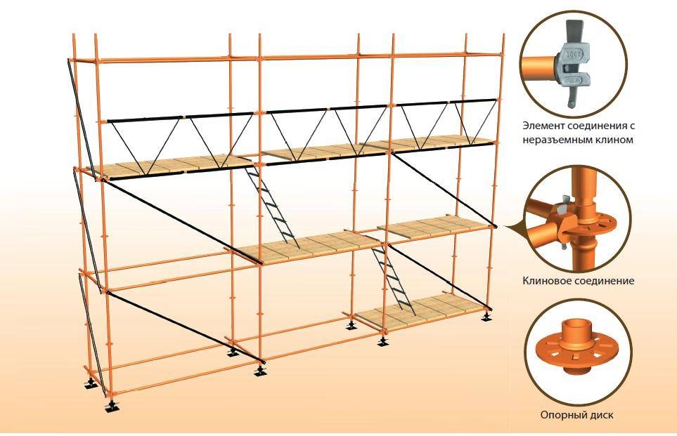 Элементы изготавливаются из металлических пустотелых труб, соединяются при помощи самотормозящего механизма, который фиксируется при помощи клина. Отсюда и название конструкции – клиновые стоечные приставные леса. На основных стойках конструктивно предусмотрены металлические диски с крепежными отверстиями строгой геометрической формы. Шаг дисков может быть от 0,5 до 1 метра. Профессиональные варианты изготовлены из металлических труб диаметром 60 мм, леса для частного использования — 48 мм и имеют ограничение по высоте.