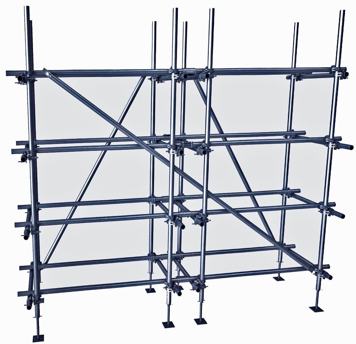 Рамные. Из прямоугольной или круглой трубы следует сварить рамы одинаковых размеров. Их фиксируют между собой при помощи укосин и поперечных труб. Имеется модульное строение, можно легко наращивать и в высоту, ив длину. Есть определенный шаг по длине, а по высоте секция равна 2 метрам, глубина в рамках стандарта – 1 метр. В некоторых видах рамок предусмотрены колеса для легкого передвижения по поверхности. Элементы флажкового типа соединяют при помощи приваривания штифов с прорезью, в которую будет вставлен флажок. В укосинах и поперечинах требуется сделать отверстия. После элементы надевают на штырь и фиксируют флажком. Секции наращиваются вверх при помощи соединительных труб с меньшим диаметром, которые приварены к стойке рам с одной стороны