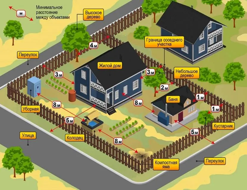 - Санитарные нормы. Регламентируют расстояние от дома до хозяйственных построек, ЛЭП, деревьев и прочего.
