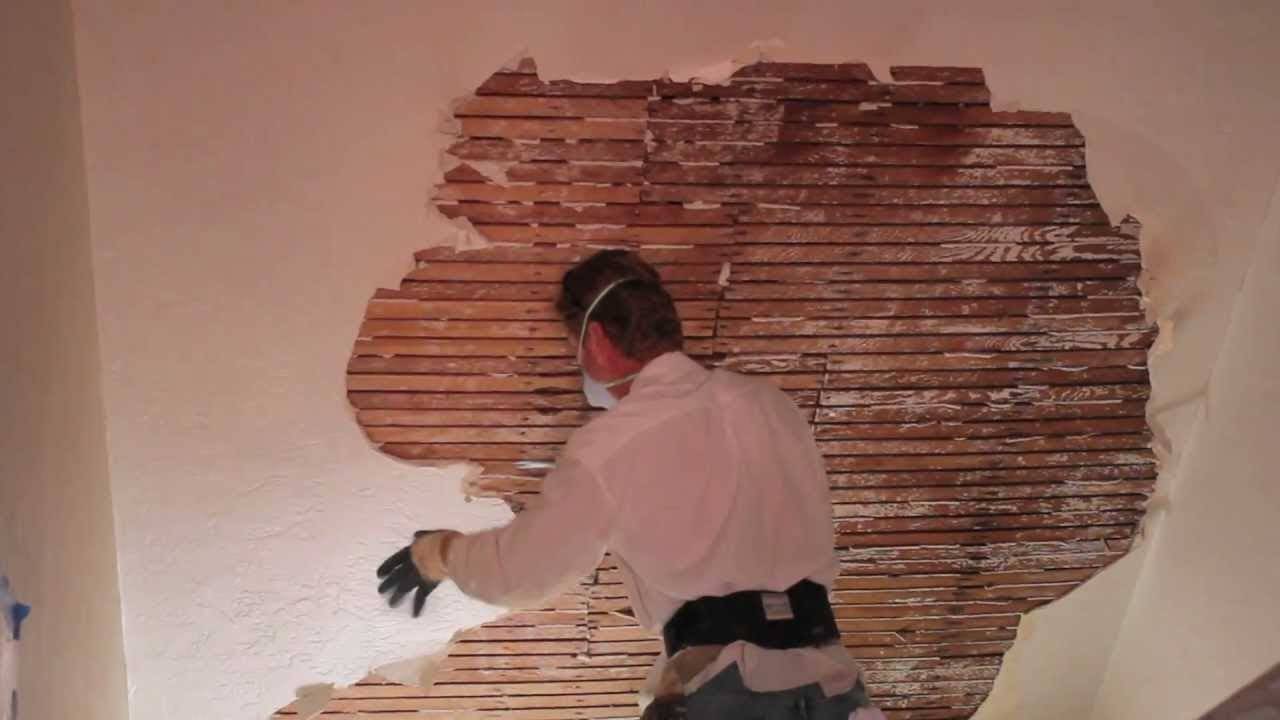 Сначала нужно осторожно простучать очищаемый участок. Благодаря этому на поверхности образуются трещины, которые позволят просунуть внутрь шпатель и подцепить покрытие. Если штукатурка не желает отваливаться под вашим нажимом, помогите себе, постукивая молотком по рукоятке шпателя