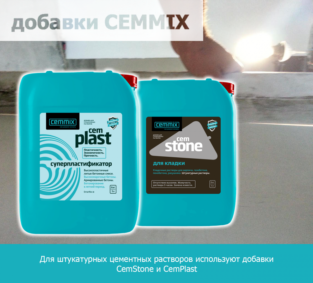 Сегодня химическая промышленность изготавливает большое количество разнообразных добавок для цементных растворов. Для штукатурных цементных растворов используют добавкиCemStoneиCemPlast.