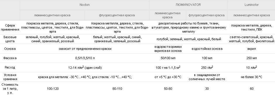 Технология изготовления светящихся красок достаточно проста, не требует дорогостоящего оборудования. Поэтому на сегодняшний день производством люминесцентных и флуоресцентных эмалей занимается большое количество крупных и мелких предприятий. Сравним продукцию некоторых из них: