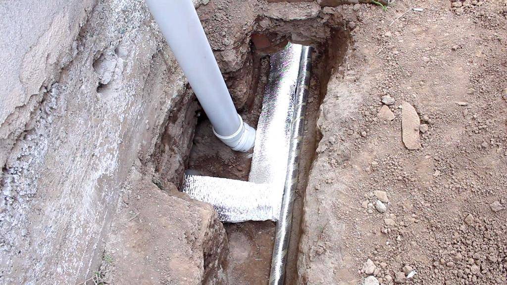 Особенно важно хорошо изолировать от холода те участки трубопровода, которые выходят на поверхность земли или проходят через фундамент в дом. Один из самых распространенных методов утепления такого ввода заключается в следующем: