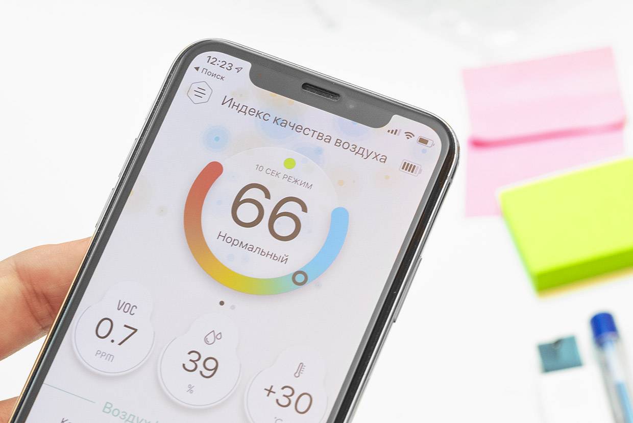 Чуть ниже текстом указаны советы, применимые к нынешней ситуации. Они оформлены в общих словах, но помогают понять, насколько всё плохо (или хорошо). В правом верхнем углу можно посмотреть заряд аккумулятора Atmotube – на самом гаджете он не отображается.