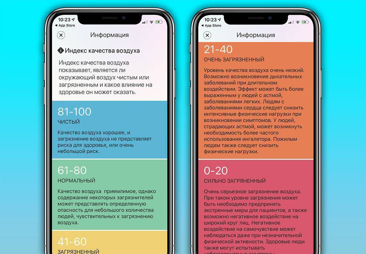 Более подробную информацию о различных состояниях воздуха можно подчерпнуть из встроенной справки. В ней степень загрязнения разбита на пять категорий опасности вместе с указанием конкретных цифр.