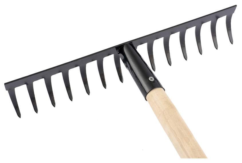 Традиционная модель. Прямыми граблями обрабатывают почву и удаляют с территории ненужный мусор. Этот универсальный инструмент оснащен поперечной перекладиной с перпендикулярно расположенными прямыми или слегка загнутыми внутрь зубьями.