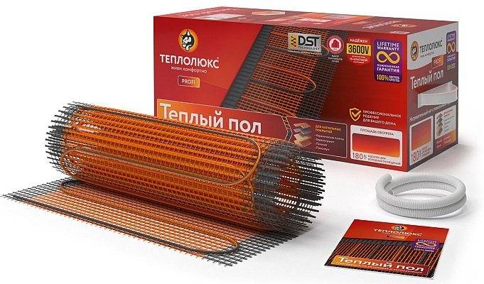 Нагревательные маты Теплолюкс PROFIMAT представляют собой греющий двужильный экранированный кабель уникальной конструкции, закрепленный на сетке из полимера. Они функционируют от обычной электросети, а контроль работы осуществляется при помощи терморегулятора, позволяющего задавать необходимую пользователю температуру, мощность, продолжительность включения. Защита от излома и ухудшения контакта обеспечивается жилами, имеющими многопроволочную структуру. Электромагнитное излучение практически отсутствует благодаря экрану из алюмолавсановой ленты. Монтировать систему можно при укладке нового пола или же поверх старого в плиточный клей, поэтому высота напольного покрытия изменяется мало. Производитель дает на свои изделия, реализуемые комплектами для комнат площадью до 15 кв. м, пожизненную гарантию.