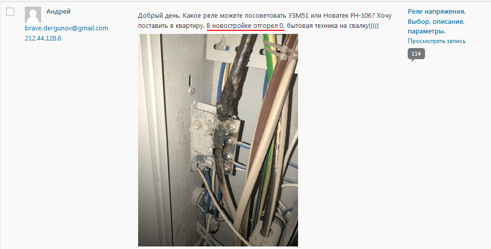 Один из случаев срабатывания защиты — отгорание нулевого провода во вводном шитке в здание. При этом вместо 220В в розетке может быть любое напряжение — от нескольких вольт, которое приводит к выходу из строя электродвигателей холодильников и кондиционеров, до 380В, при котором перегорает любая аппаратура — от лампочек и зарядок для мобилок до телевизоров и компьютеров.