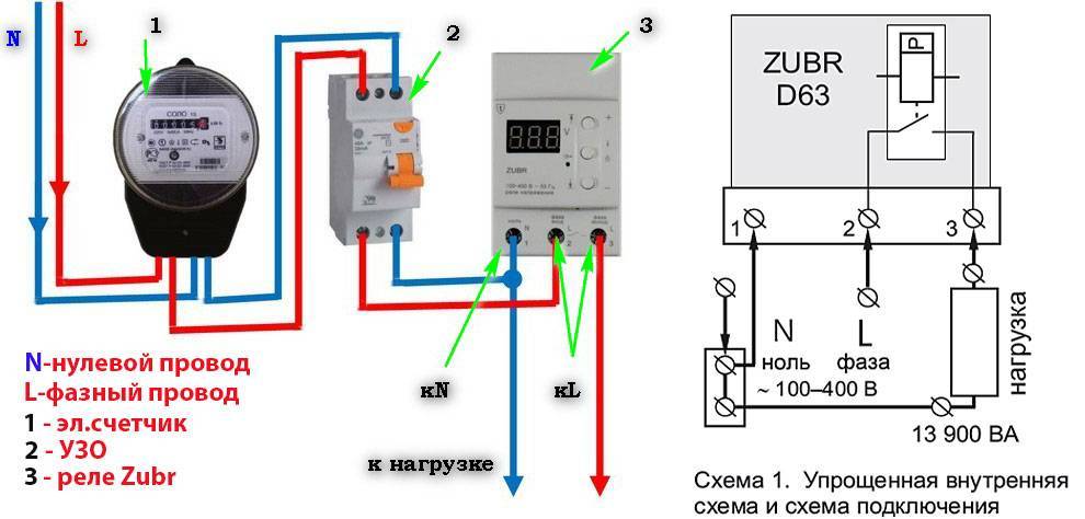 В паспорте и приведенных схемах подключения реле напряжения Зубр,