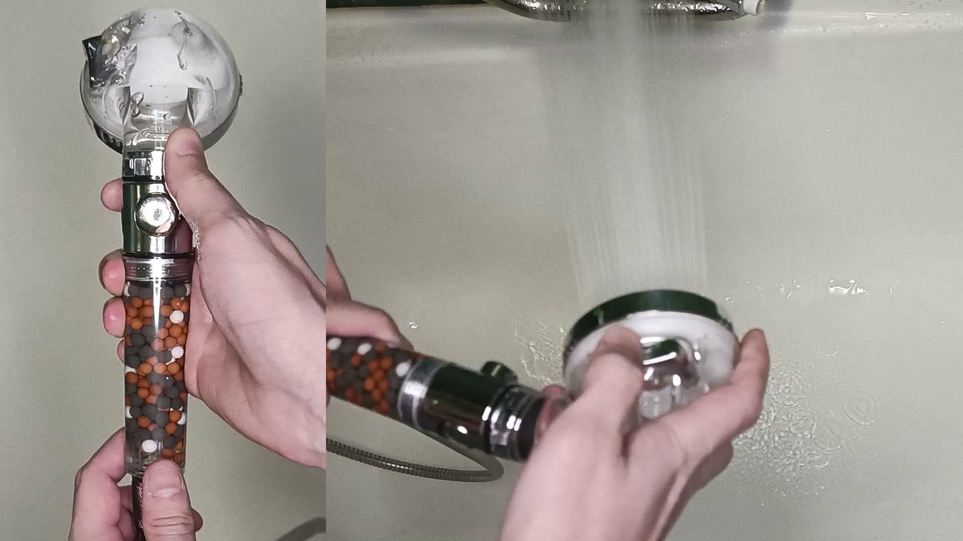 Начнем тесты с лейки для душа с камнями. Снимаем защитный колпачок и прикручиваем лейку к шлангу и включаем воду. Вода постепенно заполнило пустое пространство в насадке и пошёл достаточно сильный напор воды маленькими струйками. Ручка с камушками смотрится очень красиво и необычно в ручке с водой.